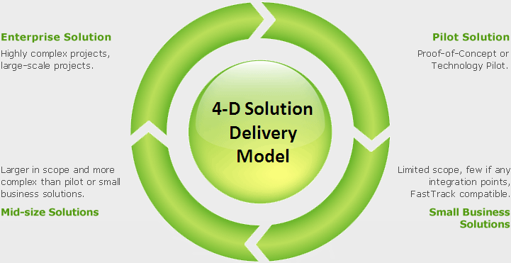 The 4-D Solution Delivery Model allows us to leverage a consistent approach in delivering solutions to provide results to our customer. The scalable nature of our delivery model allows us to expand or contract a particular phase or component based on the nature of the business and the specific project requirements.